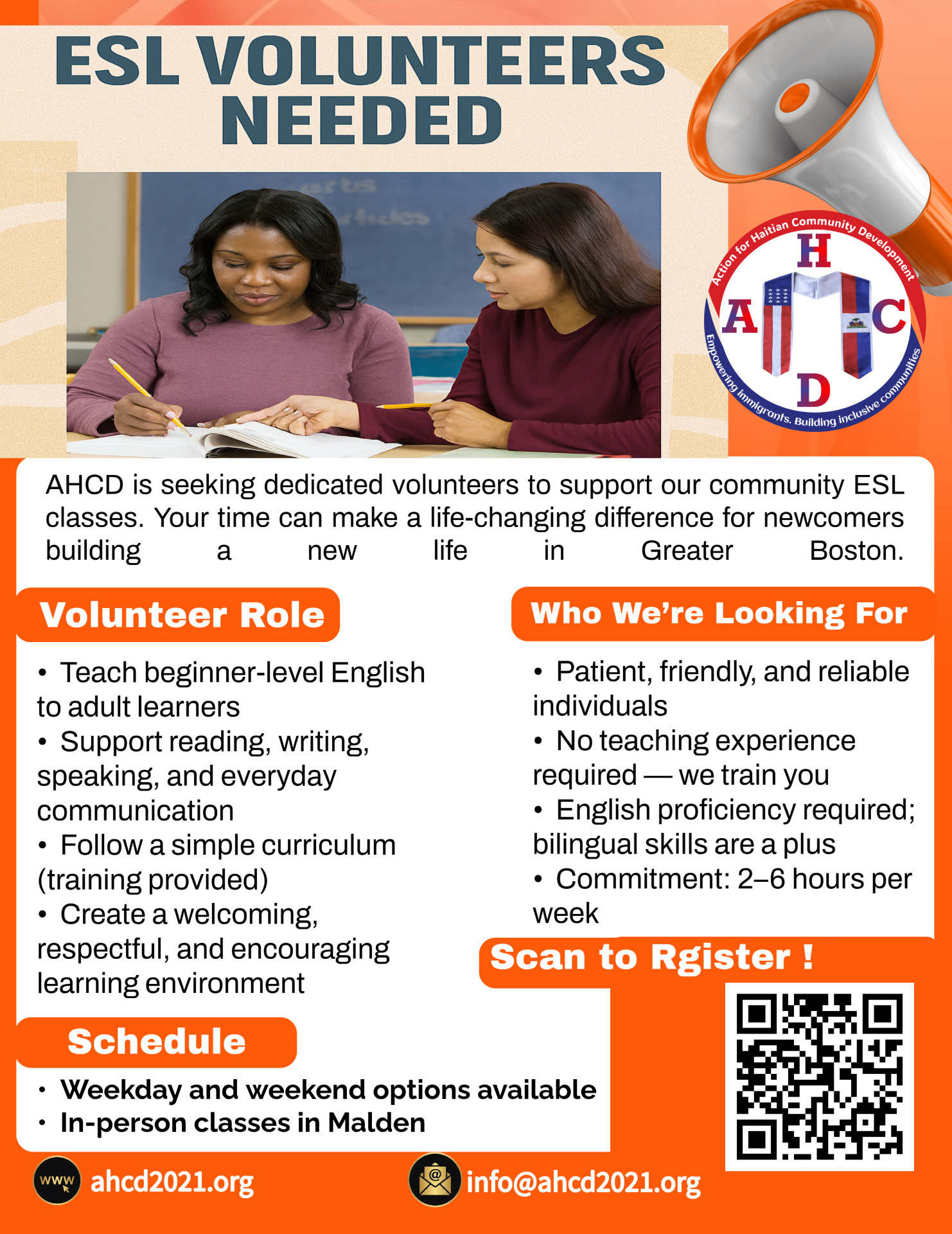 Action for Haitian Community Development, Inc. (AHCD) is a grassroots nonprofit based in Malden, Massachusetts, serving immigrant families across Greater Boston. Founded in response to urgent community needs, AHCD empower immigrant families—particularly Haitian immigrants—through culturally responsive programs rooted in social, civic, and economic integration.